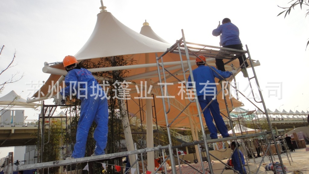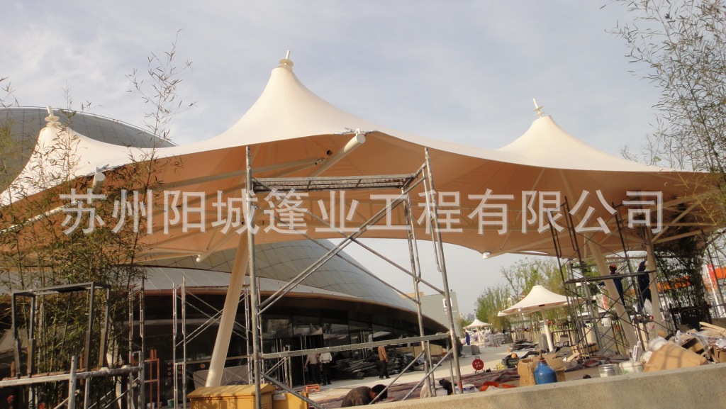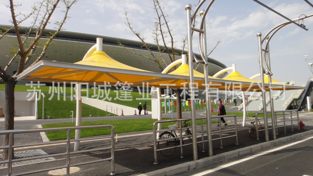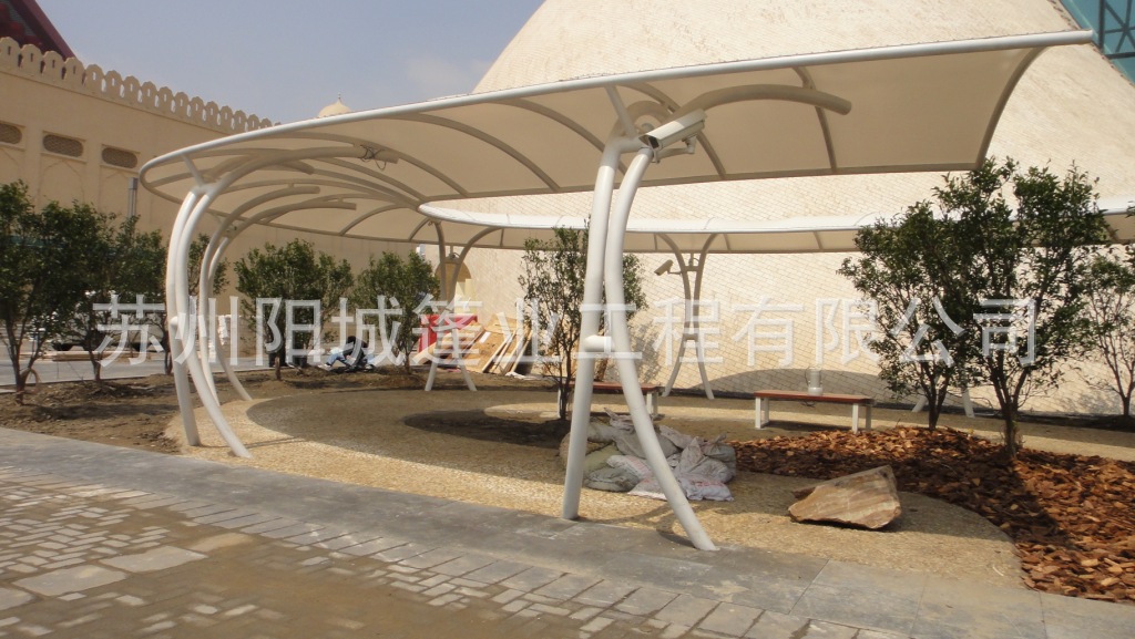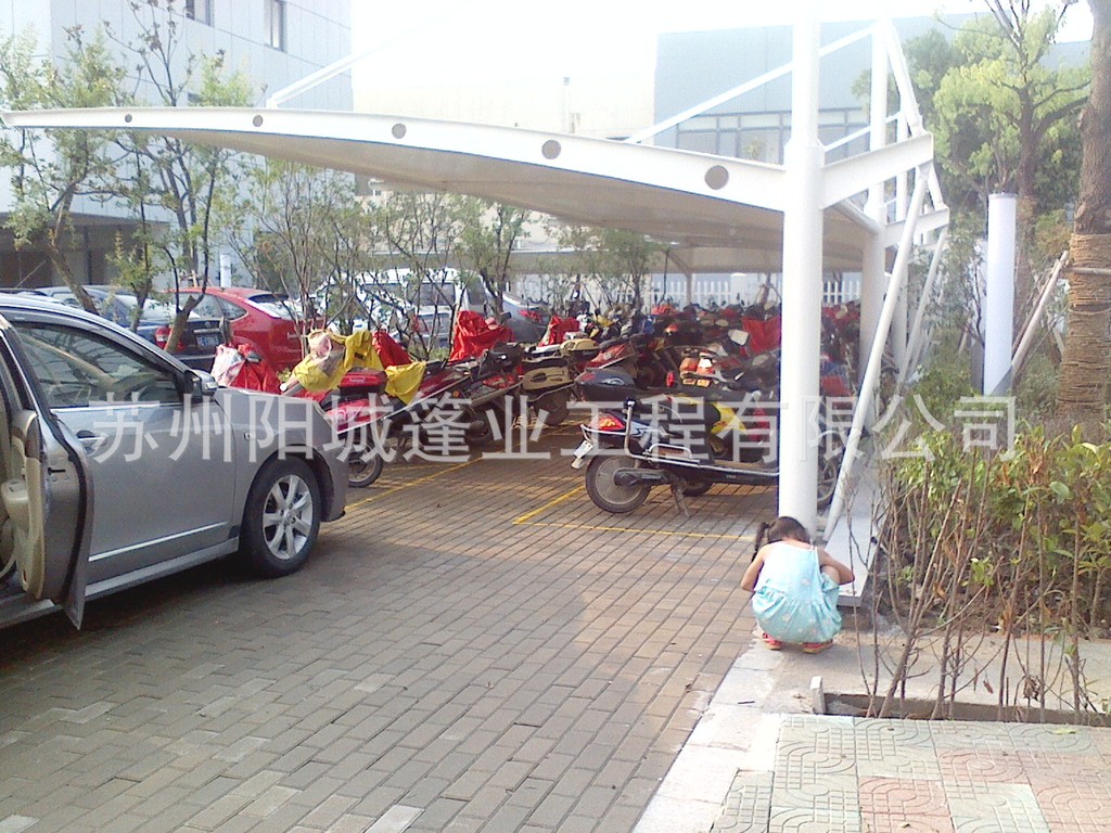 张拉膜停车篷,是一款真正美化环境优雅创新景区建筑一体户外遮阳挡雨, 夏天,通风遮阳,清凉伴您每时每刻;冬天,充足的阳光陪伴在您左右,给您无限的温馨与浪漫,夜晚可以与星星做伴。
