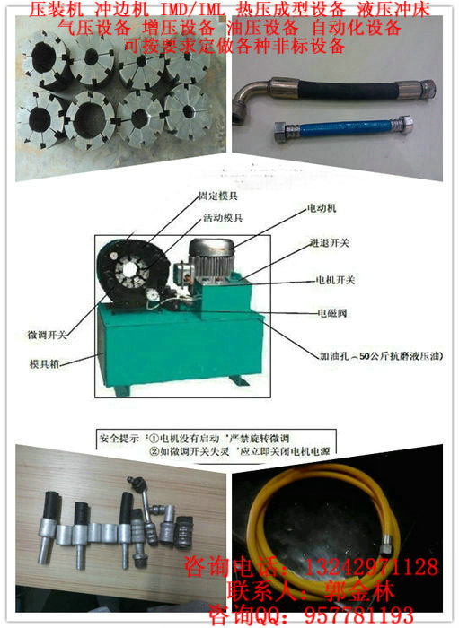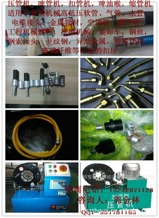 该压管机叫法很多,又叫啤管机,扣管机,啤油喉,缩管机,锁管机,啤喉机,挤压机,夹管机, 扣压机、是一种用于扣压液压油管接头管件总成的液压设备,是高低压胶管,液压胶管,水管,气管,