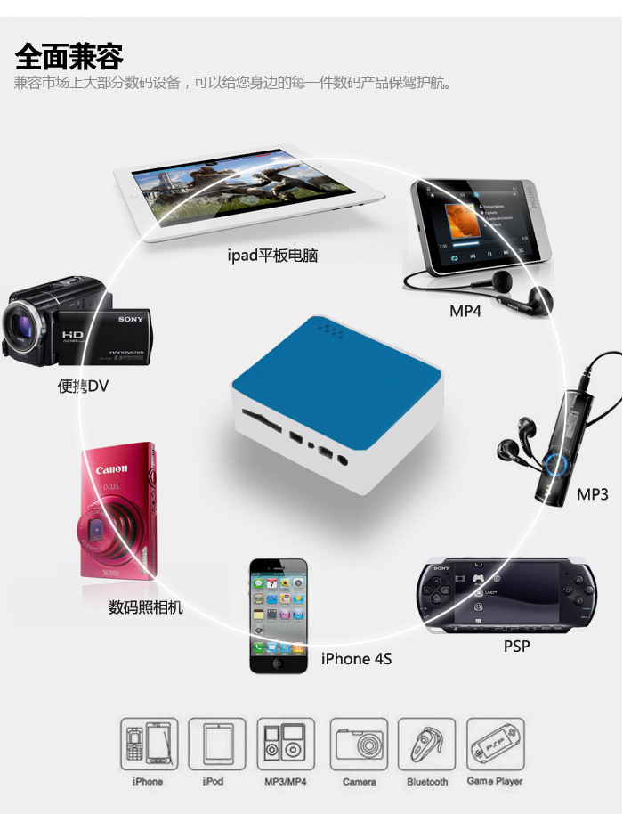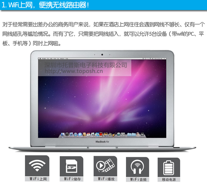 几乎能满足您旅途中无线存储、无线分享照片、音乐、视频、文档以及无线上网的全部要求!专为搭配苹果iphone、苹果IPAD、安卓手机、安卓平板电脑、智能手机、windows笔记本电脑而生。