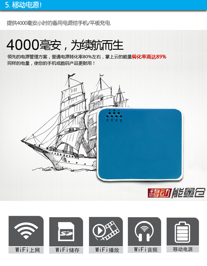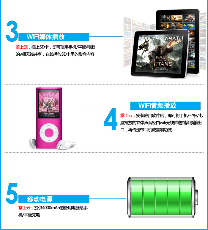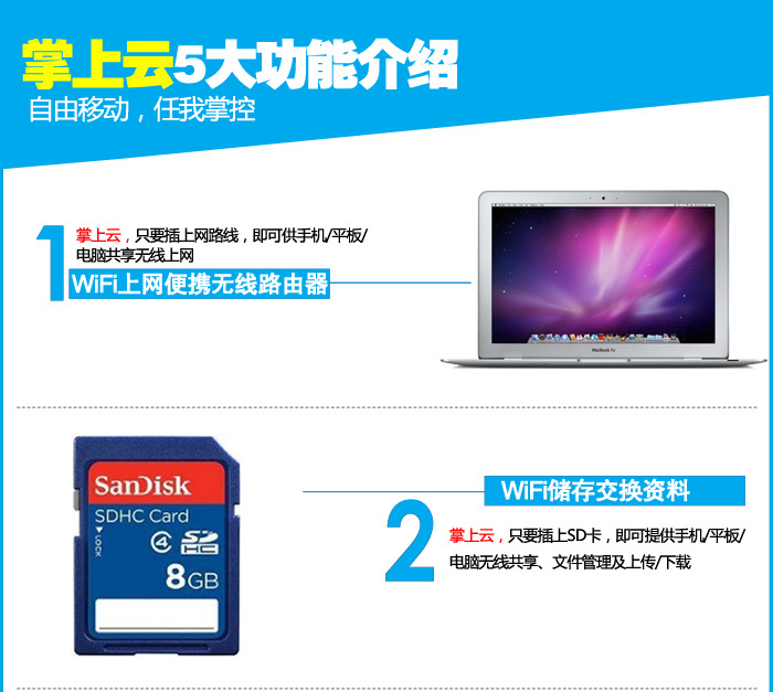 可无线移动硬盘(无线U盘、无线SD卡)+数码伴侣+有线宽带转无线网络+移动电源+ DLNA媒体服务器、