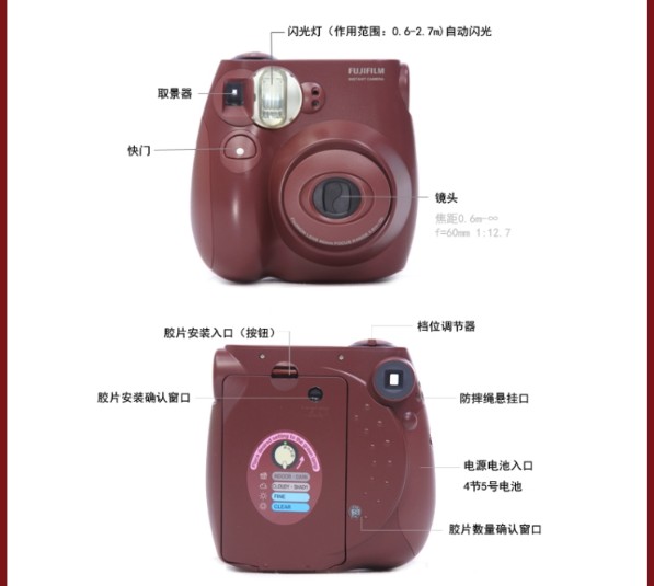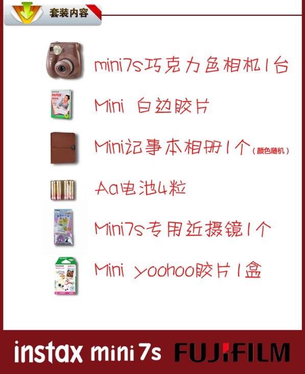 mini7S巧克力色相机1台:立拍立现,精彩无限~ AA电池4粒:可拍20盒左右哦~ Mini7s专用近摄镜1个:一镜两用,自拍和近摄,有点像数码相机的微距效果哦~ 使用说明书一本:让您轻松掌握拍摄方法和技巧~ Mini 白边胶片:白边处可DIY自己的心情~ Mini yoohoo胶片1盒:YOOHOO和它的朋友们,超可爱的五个小动物,小精灵~ Mini记事本相册1个:珍藏你“独一无二”的照片~ |