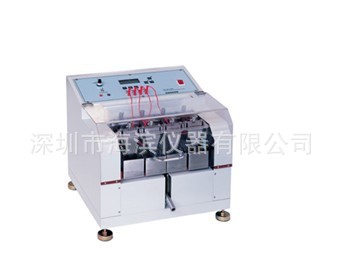 本机测试方式采用洁净的钢珠置于材料内里,钢珠本身之阻抗以及总和重量,都必须符合规定,在此条件下侦测材料曲折防水渗透指数,采用最新感应元件及特殊设计,测试中只要材料内里被水渗透立即自动停止计数或在设定时间(测试次数)到达时,即自动停机并显示时间或次数。 依据标准:ASTM-D2099 1.测试件数:1~4件 2.试片尺寸:4"*4"±0.125"(101.6*101.6±3.2mm) 3.荷重:钢珠直径 1/8"(3mm);总重:135±5g 4.测试位移:30±1° 5.速度: 90±5cpm 6.计数器: 4组,LCD液晶显示 7.马力:90W 8.体积:49*45*45cm 9.重量: 约55kg 10.电源:1∮, AC 220V,2A