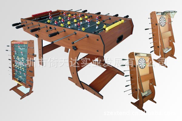 其游戏规则与足球场上踢足球一样,不同点只是由游戏者操作横杆,帮助球员将球踢进龙门得分。游戏者2~4人,将小足球由台上中间小孔投入、发球,游戏者分立于台桌两边,操作横杆踢球,根据球的动态操作正方横杆,运用技巧控制力度及方向,将球