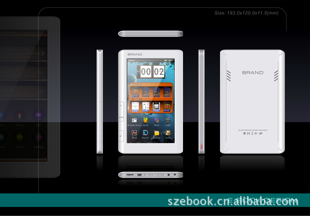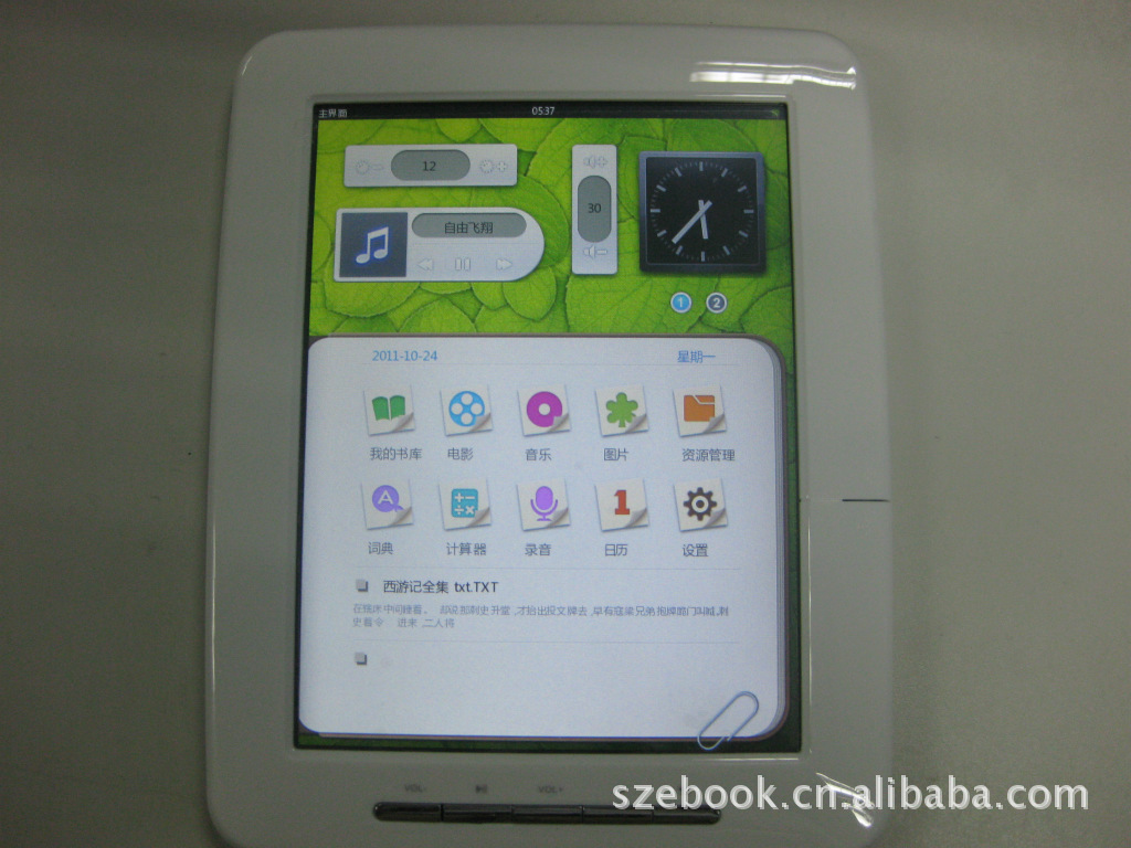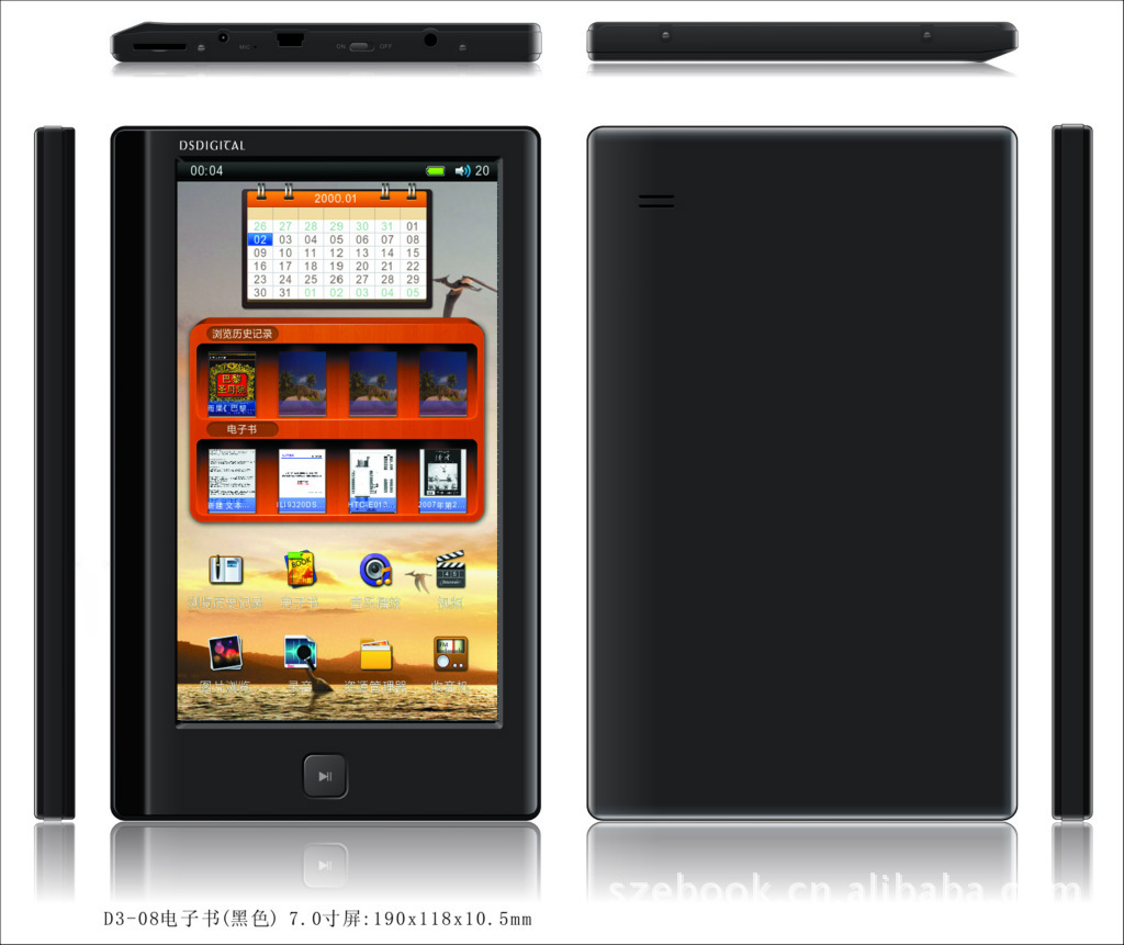 电子书功能介绍接口规格:USB2.0(High Speed)内置聚合物锂电池显示屏类型:cPAPER技术5寸/7寸480*800像素液晶屏音乐支持格式:MP3、WMA、FLAC、AAC、OGG、APE重复设置:单曲一次、单曲循环、全部一次、全部重复、试听播放设置:顺序播放、随机播放音效选择:正常、微软音效、摇滚、流行、古典、重低音、爵士录音图片浏览:支持JPG、BMP图片、图片放大、缩小功能图片旋转功能:支持0、90、180、270度旋转浏览历史记录功能文本阅读功能:支持TXT、EPUB、FB2、HTML、PDB、PDF、DOC格式文本※TXT文本:支持ANSI/UNICODE编码如果使用UNICODE编码可支持除韩文、泰文外可以支持其它语言※FB2文本:支持ANSI/UTF-8编码※HTML文本:支持ANSI/UTF-8编码※PDB文本:支持palmDOC格式※PDF文本:支持PDF version 1.3/1.4/1.5※EPUB文本:支持OCF规范※WORD文档:支持OFFICE/97/2003以下WORD档书签功能浏览模式:支持手动模式、自动模式自动翻页功能:支持10秒、30秒、50秒、80秒、100秒、120秒TTS语音朗读功能:支持TXT、HTML等格式字体放大功能用户手册(用户说明书)菜单语言:简体中文、英语、繁体中文支持日期和时间日历功能自动关机时间:支持3分钟、5分钟、10分钟、15分钟、20分钟、不自动关机系统还原功能信噪比(dB):大于或等于90dB支持软件升级SD扩展卡最长播放时间(h):音频28小时视频6~7小时电子书浏览:约12小时,3500页附件:说明书保修卡充电器(型号:U)数据线DC2.35充电线耳机质量保证卡充电器规格输入:AC100~240V 50/60Hz Max:150mA输出:DC5.0~5.5V—500mA~1500mA(DC)