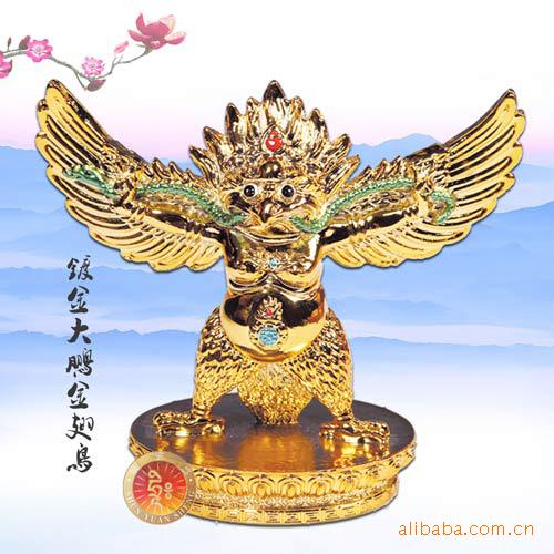 品名:大鹏金翅鸟大鹏金翅鸟又叫迦楼罗鸟,梵语garud!a,为印度古代神话中,一种类似鹫鸟,性情猛烈的神格化之巨鸟。曾为毗湿奴天之乘物。据云,其生之时,身光赫奕,诸天误认为火天而礼拜之。于佛教诸经典均载有此鸟之名,长阿含经卷十九即谓,金翅鸟有卵生、胎生、湿生、化生等四种,卵生之金翅鸟可食卵生之龙,胎生之金翅鸟可食胎生、卵生之龙;湿生之金翅鸟可食湿生、卵生、胎生之龙,化生之金翅鸟可食化生及其余诸种之龙。 大鹏金翅鸟由慈悲金刚手菩萨化现,是智慧高超之忿怒本尊,是三世诸佛智慧与方便的显现,也代表三世诸佛身口意的功德。供养大鹏金翅鸟,可消一切违缘,恶疾不染,诸障净除。大鹏金翅鸟是法王如意宝、单珍优伍布美之一切事业的象征。密宗中任何愤怒本尊的顶上空中皆有此大鹏金翅鸟飞翔,显宗中本师释迦牟尼佛在印度金刚座证道时,具六种庄严,其中顶饰庄严即此大鹏鸟,象征弘法利生事业的胜利。密宗中任何愤怒本尊的顶上空中都飞翔有此大鹏金翅鸟,显宗中本师释迦牟尼佛在印度金刚座证道时所具的六种庄严中,顶饰庄严即是此大鹏金翅鸟,这象征着弘法利生事业的胜利。功德:大鹏金翅鸟下方的山岭表示法王如意宝的前世伏藏大师列绕朗巴授记法王今世的诞生之地,海水表示法王的母亲(法王母亲名为璁玉海),莲花表示法王的父亲(法王父亲名为巴德,意为莲花),莲花上之大鹏金翅鸟及顶上如意宝中间的白色阿字,都代表法王如意宝(因为法王梵名为"阿白拉江嘎),嘴中含蛇表示遣除末法时期佛法的一切违缘,降伏一切的魔障,空中左右之日月表示佛法兴盛,佛光普照,使一切无明黑暗中众生获得光明。大鹏金翅鸟上还包含着密宗息、增、怀、诛四事业的深广的含义,同时也代表三世诸佛身口意的功德。大鹏金翅鸟可以作为上师、本尊来祈祷,也可作为护法空行来供养。