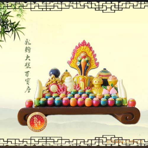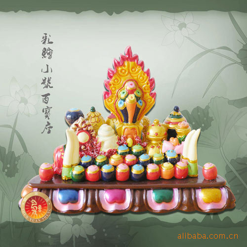 品名:中号百宝座规格:前宽16.2CM,后宽10.8CM,高11.8CM,厚度6CM法物材质:树脂彩绘 顺圆盛总集摩尼宝朵玛又名百宝座,是坛城上主要供佛圣物,其上设置集合宇宙间的七珍八宝等之供佛最珍贵吉祥供品,例如内有象牙,摩尼宝,如意宝,宝镜,海螺等大量供物.令十方诸佛菩萨圣众喜悦,供养之行者聚集福慧资粮。摩尼宝具有八种功德第一、能照耀黑夜,放出光茫,在酷热中,放出清凉的光。第二、止息一切干渴,令一条八功德水出现。第三、令拥有者随心所欲,立即化现满其所愿。第四、放出个种不同颜色的光。第五、摩尼宝所在之处,其周围的众生都不会生病,心也会一直处在宁静之境。第六、可阻止恶龙下暴雨成灾。第七、一切忧伤..不好的情境会消失,而树木、花园、莲花则会圆满化现出来。第八、人不会遭遇不时之死,被野兽所伤,有情众生也不会互相残害。