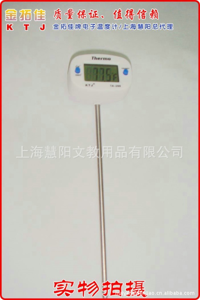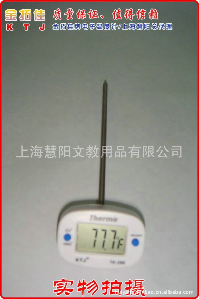 适用范围:本产品可直观准确的测量煮食、加热、解冻、饮料、实验室、工厂产品特点:宽测量范围:-50℃~300℃ ( -58℉~572℉ )探针长度:15cm规格:44mm*30mm*30mm便 利读数:180度调整表头角度设计,清晰大液晶显示。使用方法:开机:按ON/OFF按键测试温度:将探针插入被测物体中部读 数:将表头调至最佳可视位置,数秒钟后屏幕显示的数字即为准确温度。 注意事项:请勿用本品测试温度超过 300℃以上物体。本产品使用完毕时,请用温水或中性清洁剂清洗,并将探针插入胶套,请勿将表头浸入水中清洗。工作温度范 围:-5℃~50℃ (-23℉~122℉)