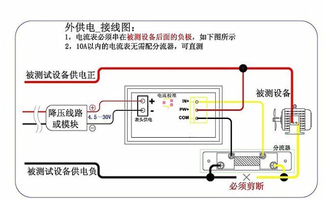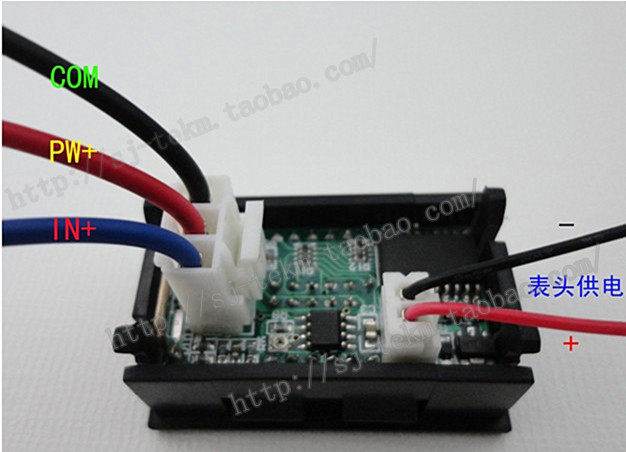 IN+ -----蓝线:电流输入端;因为表头采用共地设计,即测量端的地线与供电端的地线是相通的,所以只能接到被测设备负极与电源负极之间。