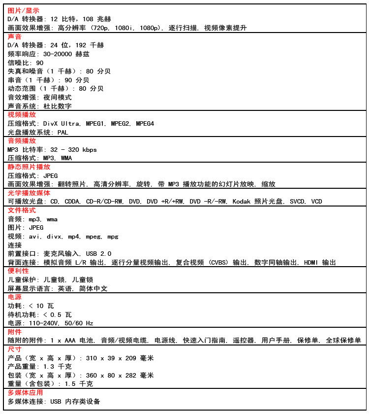 可播放 CD、(S)VCD、DVD、DVD+- R/RW、DivX、MP3、WMA 和 JPEG |