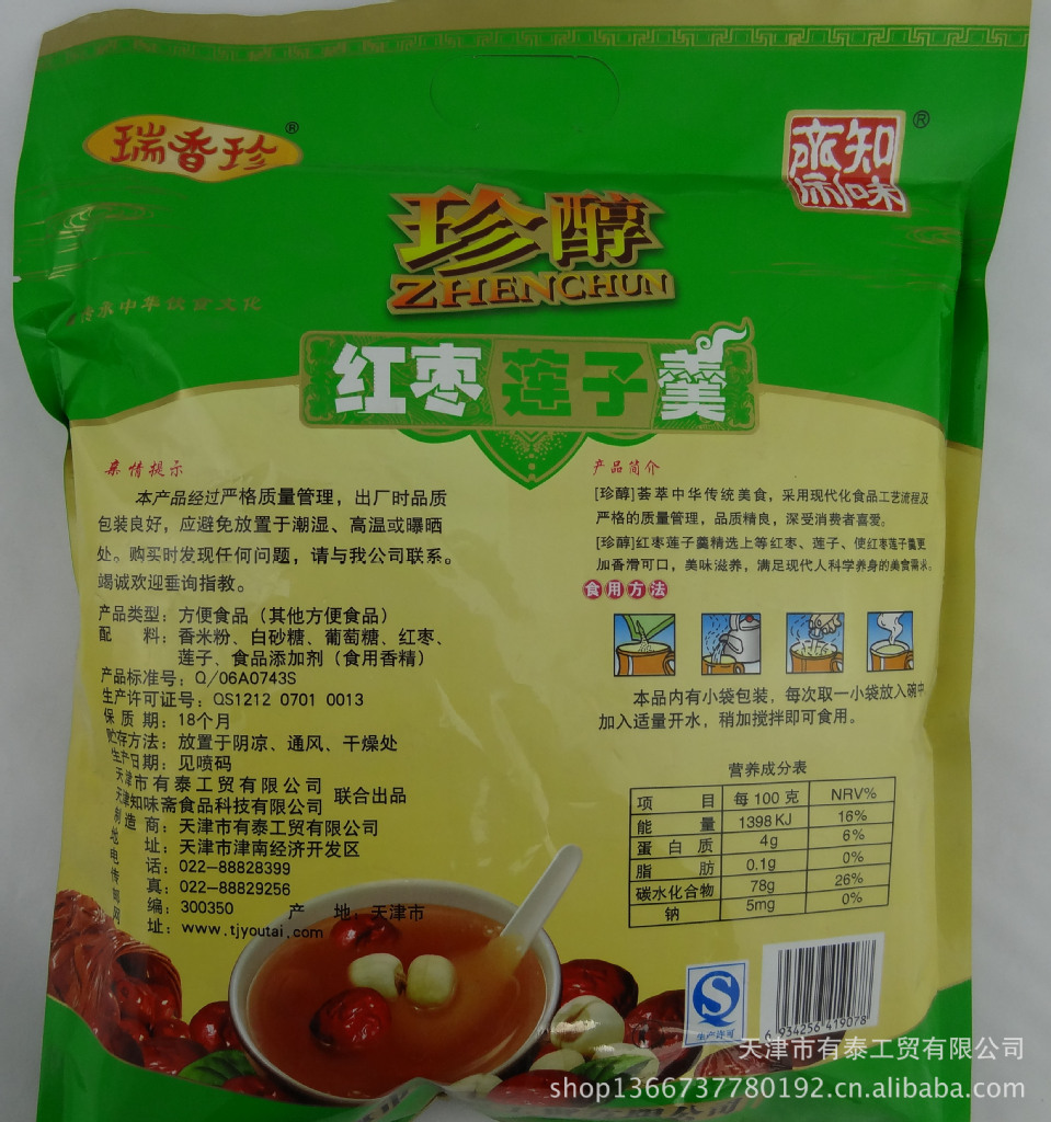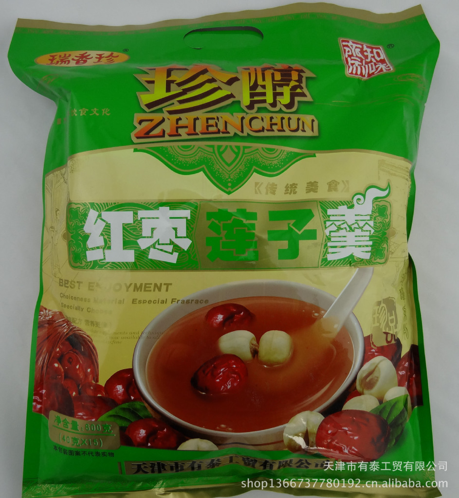 本产品精选优质红枣、莲子肉、香米等为主要原料,枣肉丰富,香糯诱人,易冲易熟,食用方便,是适合于各种人群食用的滋养美食。