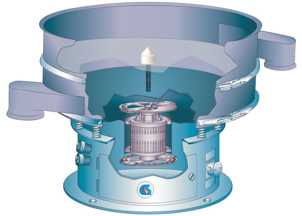 VICTORY振动筛工作原理是围绕中心振动的筛分机,通过振动电机驱动上、下两个配重盘产生振动。上部配重块在旋转中产生水平振动,驱使物料从中心往边缘直线移动。下部配重块在旋转中产生垂直振动,驱使物料上下振动。筛网上物料的运动速度、螺旋大小均可根据所需筛分产品(干或湿、轻或重、粗或细、冷或热)的最大处理量和筛分效率精确设定。