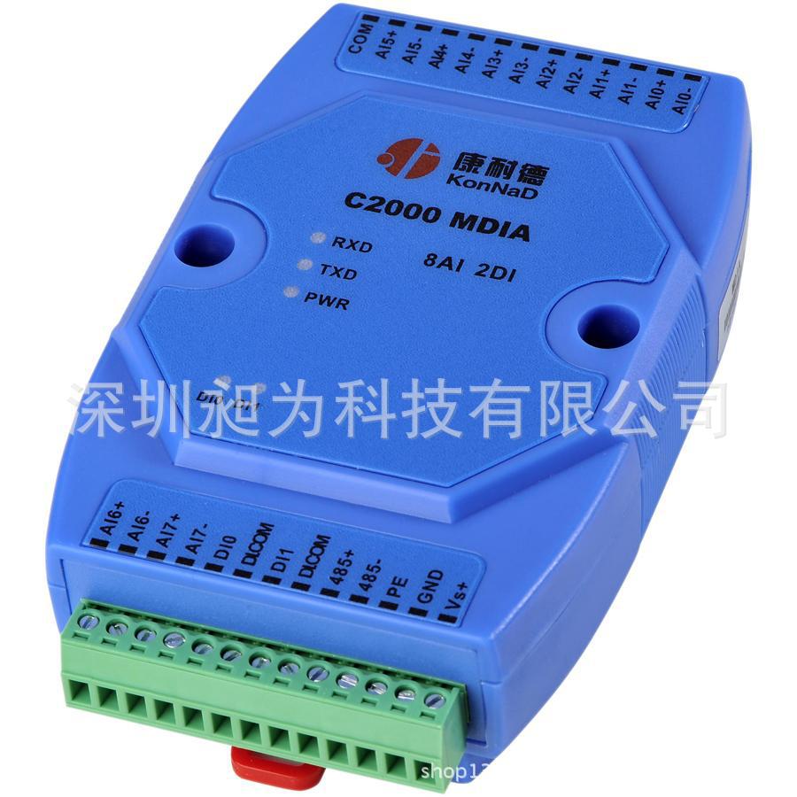 C2000 MDIA为通道隔离型智能模拟量数字量采集器,8路电流型模拟量输入(量程为 0~20mA),采用满量程通道隔离、全差分输入设计。2路数字量(干接点)输入,RS485接口光电隔离和电源隔离技术,有效抑制闪电,雷击,ESD和共地干扰。为系统集成商、工程商集成了标准的Modbus RTU协议。通过RS-485即可实现对远程模拟量和开/关设备的数据采集和控制。下层设备通常有接近开关、机械 开关、按钮、光传感器、LED以及光电开关等数字量开关设备及PH、电导计、温度计、湿度计、压力计、流量计、启动器和阀门等模拟量设备。