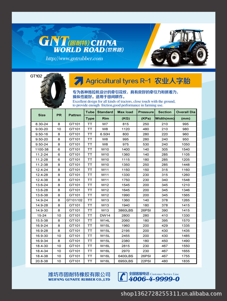 公司主要生产的人字花纹的农业轮胎的型号如下: