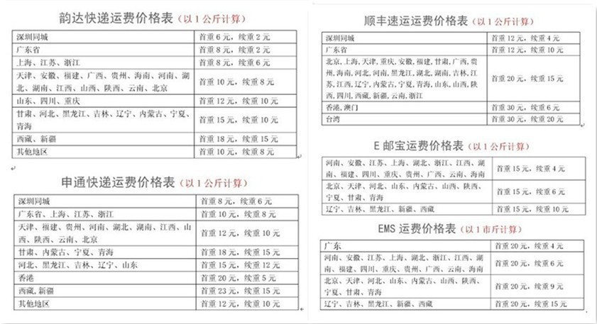 1.以上价格为快递公司提供,下单前请先查询买家收货地址能否到达下单前请先查询买家收货地址能否到达下单前请先查询买家收货地址能否到达下单前请先查询买家收货地址能否到达,再选择快递公司下单,如果您选择的快递公司未能到达,退回运费请自理。