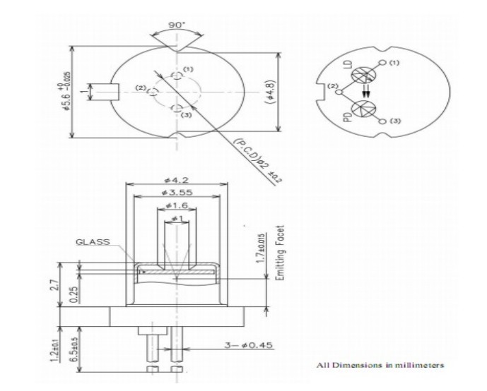 波长:660nm 输出功率:130mW 特点:效率高、性能稳定、工作寿命长 LD反向电压:2V PD反向电压:30V 工作电流:145-200mA 阈值电流:55-70mA 工作电压:2.5-3V 斜率效率:1.1W/A 工作温度:-10~+60摄氏度 存储温度:-40~+85摄氏度 工作寿命:大于10000小时