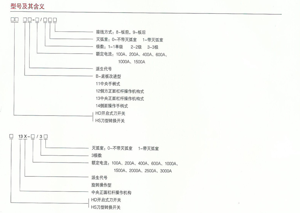 HD、HS系列开启式刀开关和刀型转换开关主要用于交流50H,额定电压至400V,直流至440V,额定电压至1500A的成套配电装置中,作为不频繁的手动接通和分段交直流电路或作隔离开关用。其中: