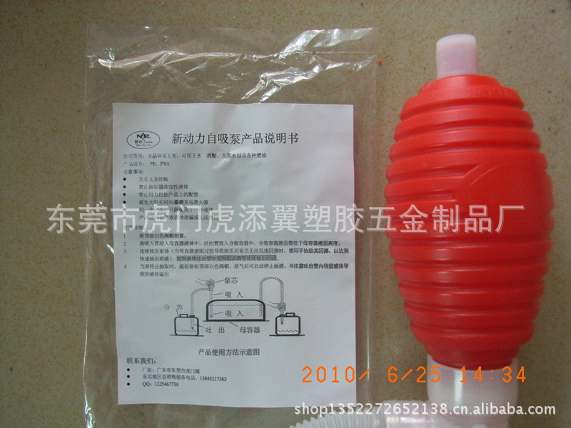 商品名:塑料油抽、油泵型号:大,中,小三款!注:我司有多款油抽现成模具,及完成品,可以直接生产,或供货。价格可面议,欢迎各界朋友前来参观洽谈,谢谢!!!使用功能:1,手动塑胶油抽(油泵)是高品质耐腐蚀产品.适用于淡水抽取,化工液体及大油桶与小油桶的抽取.。使用更方便,保管更卫生。使用注意:1、不可让儿童接触或玩耍。2、禁止抽取强腐蚀性液体。3、禁止拉扯产品配件。4、产品破损会导至液体外泄,产品失去使用功能。使用说明:1.使用前首先将产品顶端白色气阀帽扭紧。2.将产品吸入管浸入母容器液体中,输出管放入分装容器中。3.连续捏压泵心,直到泵出液体为止(分装容器液体面需低于母容器液体面高度。当母容器液体面低于分装容器液体面时,需手动抽出余下液体)。4.当要停止抽取时,提前扭松产品顶端白色气阀帽,进气后即可自动停止,但注意输出管内残留液体外溢。5.附使用操作图示: