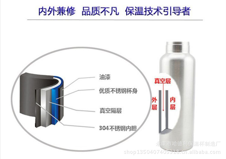 永康哈德利保温杯制造厂可为企业、单位举办活动的广告杯、礼品杯设计制作,可在杯盖、杯体、包装盒上印制公司logo、文字等,是各种促销、品牌宣传、纪念留念、商务或个人馈赠的实用礼品。本厂技术力量雄厚,生产工艺先进,研发能力强,产品更新快,是一家集研发、生产、经营、服务于一体的保温杯专业生产企业。产品有:保温杯、子弹头杯、旅行壶、运动壶、广口壶、咖啡壶、酒壶、汽车杯、办公杯等300多个品种。并且不断推出迎合市场的卡通杯、礼品杯、广告杯、保健杯等系列新款式,产品设计新颖,制作精良,健康时尚,规格齐全,价格合理 。 本厂拥有自营进出口权。本厂承接:按客户要求量身定做和按客户授权印刷LOGO。 我厂本着“忠于客户,诚信为本”的经营理念,希望与各界朋友真诚合作,共创双赢。欢迎海内外新老客户、各企事 业单位来电、来函、来图来样开模制作洽谈!