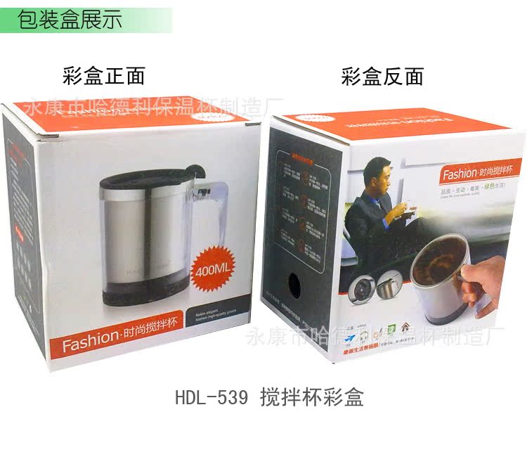 品名:哈德利-自动搅拌杯 型号:HDL-539 容量:400ml 材质:采用高级304不锈钢 装箱明细:50只/箱 欢迎新老客户咨询洽谈,质量、款式、价格包您满意! |