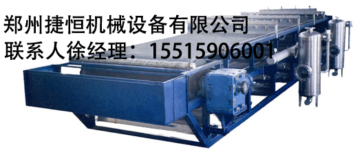 2.真空盒:橡胶带中央的排液孔和真空盒上的集液口在一条线上,滤液经橡胶带进入真空盒后再经真空盒下部的软管排除。真空盒上部的摩擦带采用耐磨和摩擦系数较小的材料制作,并且使摩擦带的两面摩擦系数不同,保证摩擦等待随橡胶带一起运行,避免了橡胶带的磨损。为了便于摩擦带更换,真空盒可用螺栓螺母调节升降。