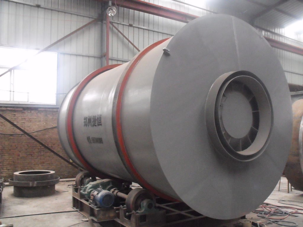 有输送机把湿物料输送到热风炉上面的料仓里通过热风炉的流沙管到烘干机,在烘干机的的内部装有打散装置把物料迅速的打散,使得物料充分的于热风接触,更加有效地烘干物料,在内筒壁上有螺旋状导流叶片,主机运转时是物料扬起并烘干、推进。物料到中筒反料筒把物料进行二次扬料烘干,再次反推进使得物料到外筒进行扬料、烘干、推进、从出料口出了成品物料,本机采用三层互保温式设计原理。