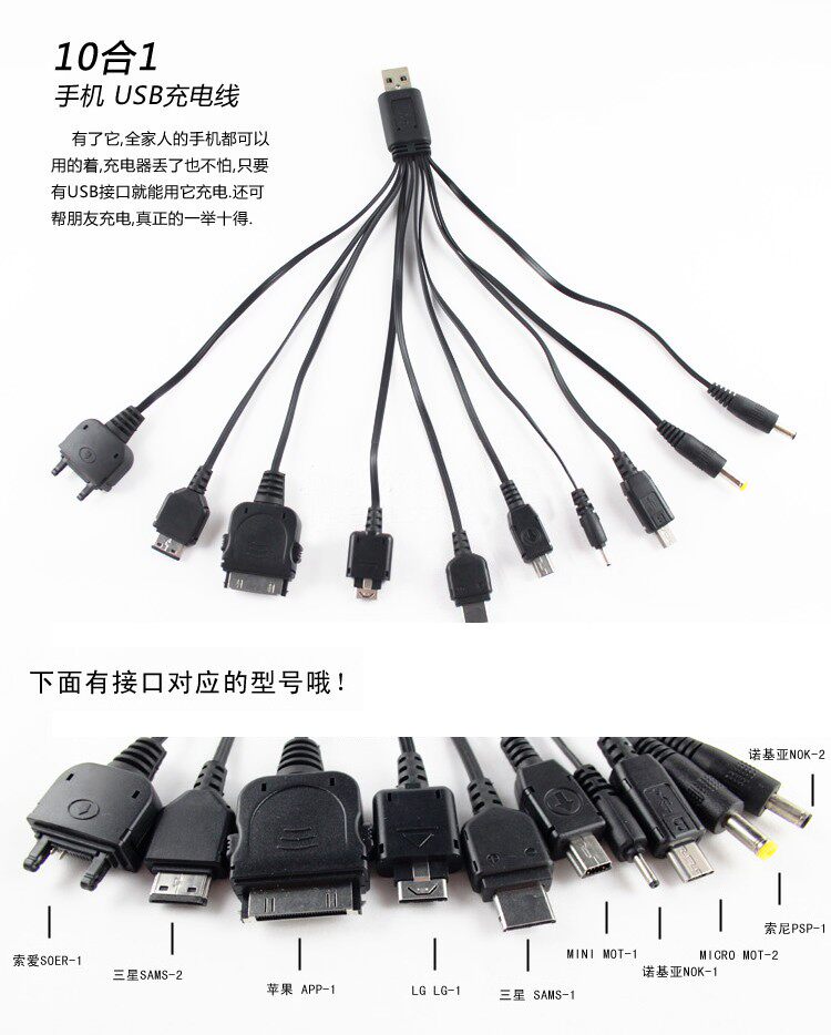 10个充电线接头分别为:APP-1、LG-1、MOT-1、MOT-2、NOK-1、NOK-2、PSP-1、SAMS-1 、SAMS-2、SOER-1。