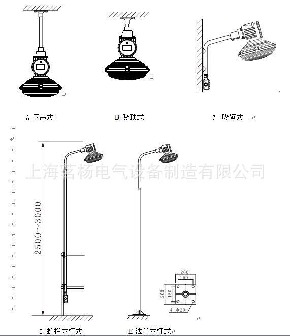 8. 本灯具为管吊式、吸顶式、吸壁式安装,也可用于立杆式安装。(见安装示意图)。