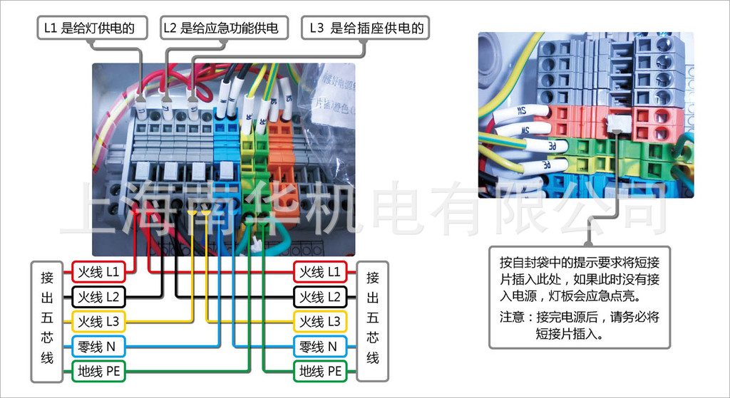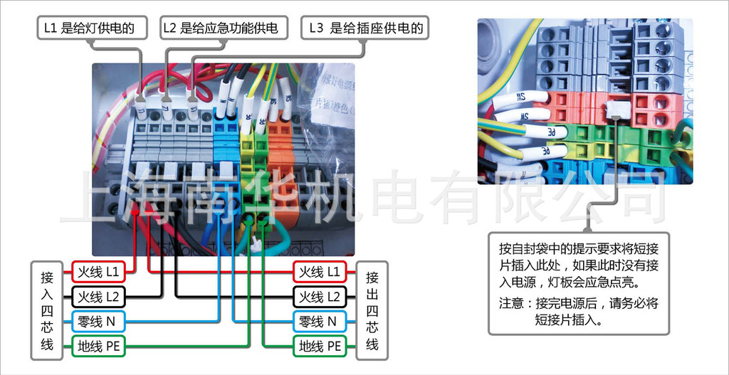 L1、L2、L3可以是同相,但L2需持续供电给电池充电。电源线接好后请将所附短接帽插入图示SW SW槽内,此时将启动应急,通电后将自动切换至正常状态。