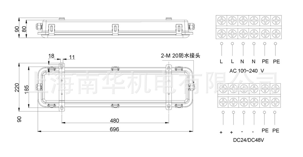 • 灯具上配有M20的金属填料函,由此接电源输入线和输出线。