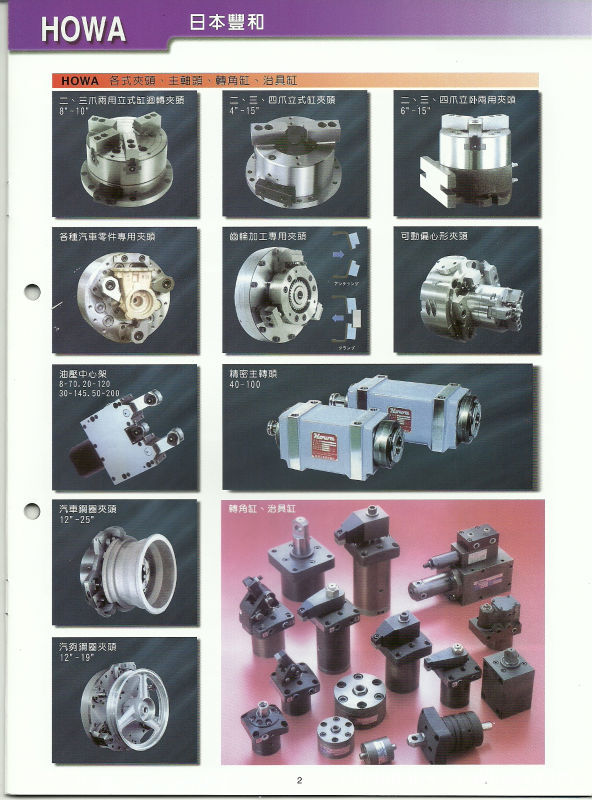 我公司是以下品牌的大陆总代理: 日本 HOWA 丰和、德国 MARQUART 、以色列 P.M.L-P.A.L 、韩国SEOAM、 日本KOYO、韩国SINKANG等多种品牌!台湾自制品牌日新山川(YAMAWKAWA) 。供应三爪中空/中实卡盘、二爪卡盘,偏心补偿卡盘、长行程卡盘、快速换爪卡盘、三爪高速超大孔、中空/中实油缸、油压中心架、汽车钢圈夹头、等。前推式/后拉式:弹性筒夹和橡胶筒夹等。固定端面后移三爪、外张型套筒弹性夹头、油压膨胀心轴夹头、半自动/全自分度卡盘,球阀/十字阀等阀门加工卡盘等。大型立、卧油压夹头,各式手动夹头、大孔径卡盘等.
