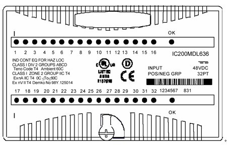 开关量输入模块IC200MDL636提供32点开关量,输入可正逻辑或负逻辑。输入设备连接到模块的输入端和COM端。