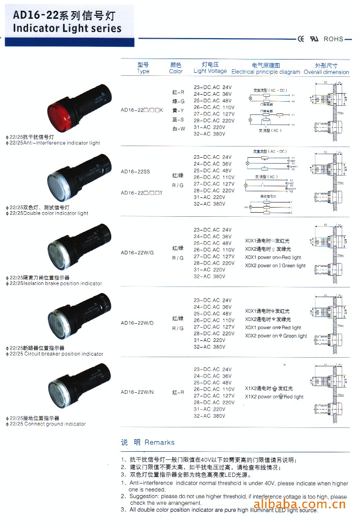 适用于电力、电讯、机电、船舶、纺织、印刷、矿山机械等设备的线路中作指示信号、预告信号、事故信号及其它指示信号、符合国家GB/T4048.1、GB/T4048.5。AD26抗干扰信号灯用于感应电压较强的地方通常限制电压在12V-100V,抗浪涌信号灯是我公司最新开发产品,符合MC电磁兼容(GB/T17626.2-6)。