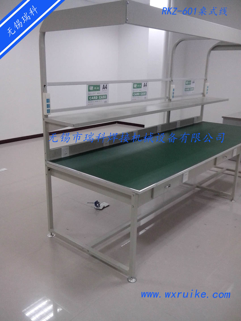 3.线体台面采用宽1200mm、厚16mm木板,上铺2mm防静电台皮,四周专用线材包边。