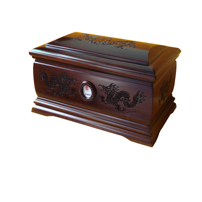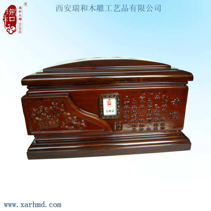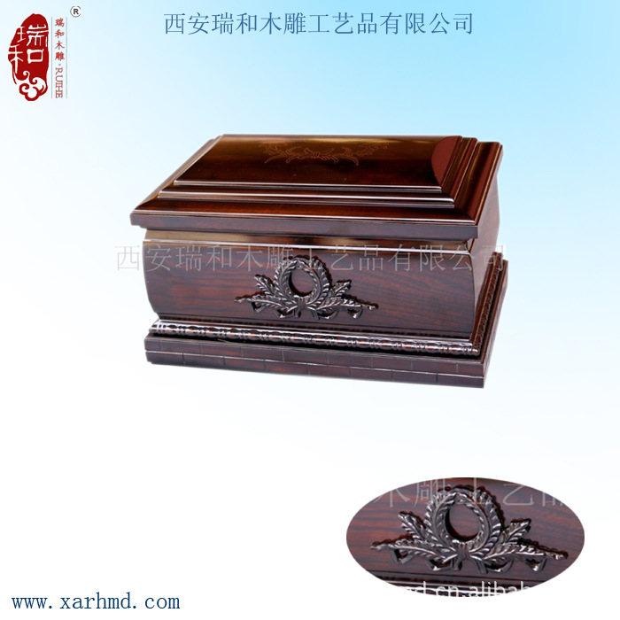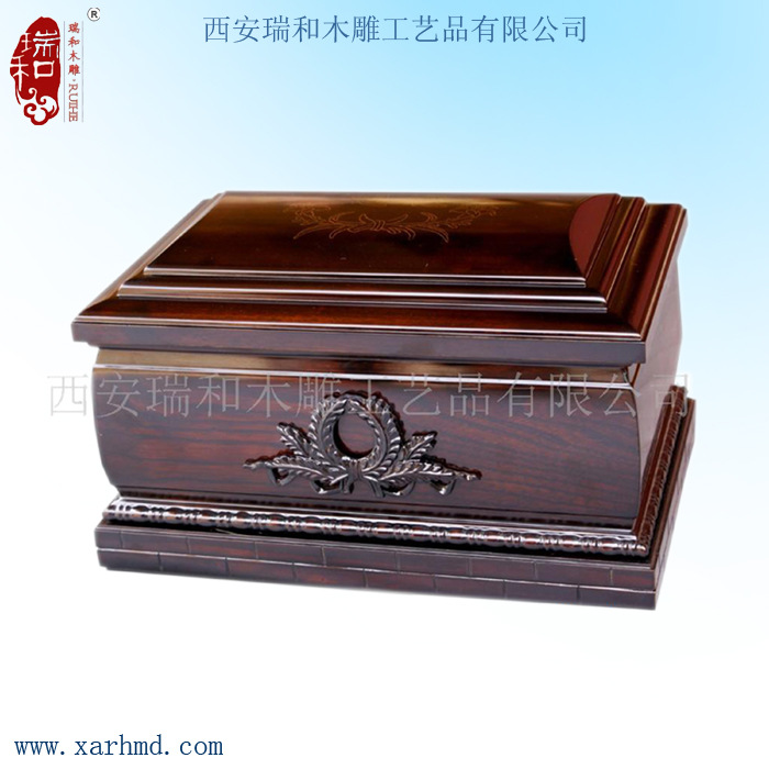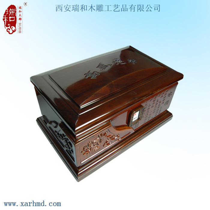 【说明】:西安瑞和木雕工艺品厂生产的骨灰盒选用优质南洋红檀为原料,该木木质硬重,耐腐,木质细腻光滑,属名贵木材。本产品造型新颖大方,线条流畅,艺术美观,工艺精湛,加上采用高档PU金铜漆喷漆工艺,漆面光亮,更显富有名贵,大气庄重,属高档寿盒。