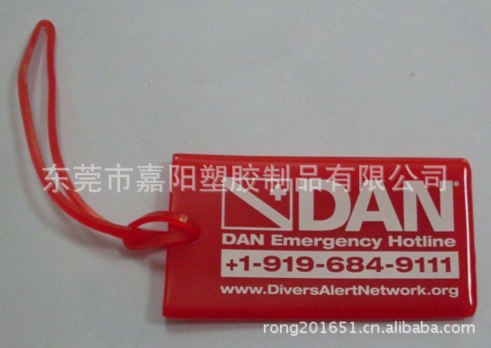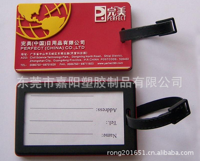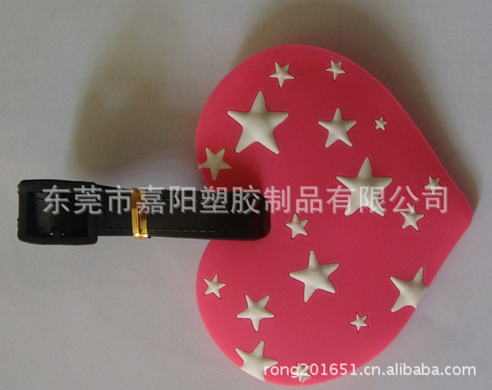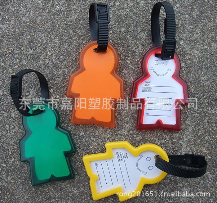 东莞市嘉阳塑胶有限公司,专业生产行李牌厂家。销售各种旅行出国用品吊牌,材质上选择pvc或环保硅胶,通过先进的工艺技术,滴胶/塑料成型。各种卡通的3D图案,凹凸有致、色彩真实且不会褪色,作为行李的标志和旅客领取托运行李的凭证,通常应用于旅行箱、拉杆箱、旅游箱包托运。PVC行李牌具有耐用,耐脏的特点,这些优势特征使PVC软胶李牌成为目前应用最广泛的行李牌。