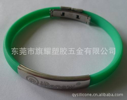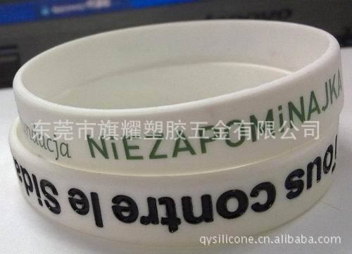 6.夜光硅胶手环:此类手环在炼胶的时候加入荧光粉一起混炼,成型的时候跟普通硅胶手环一样,需要在晚上才看得到荧光效果,有红光,绿光,蓝光,晚上,它更加引人注目。