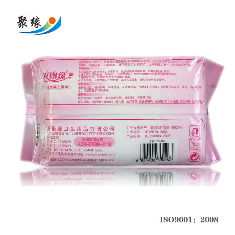 玫瑰缘彩云婴儿湿巾,是聚缘公司根据健康环保的理念的推出的无香型系列湿巾之一,本产品不含酒精,不含色素,不含香精,真正做到了水润呵护,远离刺激,新生儿也可放心使用。