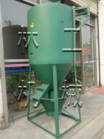 工作原理:由饲料搅拌机下方进料口加入需要混合的物料,由饲料搅拌机内的提升螺旋将搅拌物料从立式搅拌机的进料斗进入立式螺旋输送器,向上提升到达顶端后,再以伞状飞抛,从混料筒四周下落,从套筒底部的缺口处重新进入立式螺旋输送器,再次向上提升,如此循环搅拌混合直到混合均匀,打开出料口将物料卸出。