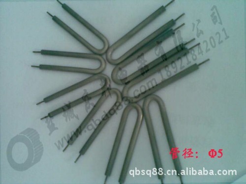 U/W型电热管是在不锈钢管内均匀分布高温弹簧状电热丝,并在周围空隙填入导热和绝缘性能良好的氧化镁粉,通过引出棒与电源线连接,或者直接出高温导线、防水线。金属管状电热元件机械强度好,可按需求弯成U型电热管、W型加热管或者异型发热管。
