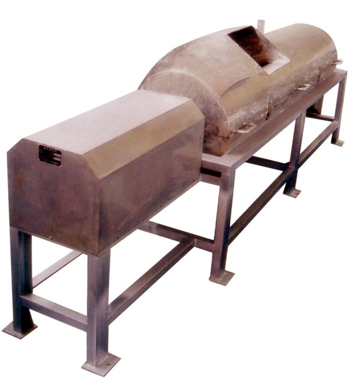 猪爪刨毛机是近几年为大中型屠宰厂设计研制生产的猪爪刨毛专用设备,具有结构简单、使用维修方便、脱毛率高等特点。猪爪烫毛后可连续进行工作,具有较高的生产效率。特别解决了刀切面带毛而从未解决的问题,提高了产品质量。本机为卧式结构,主要由机架、筒体、主轴、喷水管组成,筒体内周边焊有螺纹钢,减速机作为动力源,通过链条传动带动主轴旋转,主轴上装有拨动橡胶板。 将烫好的猪爪从加料口进入该机后,由主轴带动拨动橡胶板拨动猪爪在机内转动,通过周边螺纹钢对猪爪磨擦而进行脱毛,同时水管自动喷水,从而达到刨毛清洗猪爪的效果;猪爪可连续进入,脱毛后自动排出,停机后将猪爪放入清水池,重复操作,脱毛效果更加理想;脱毛后的猪爪由出料口自动排出,这样减轻了工人劳动强度,提高了工作效率。