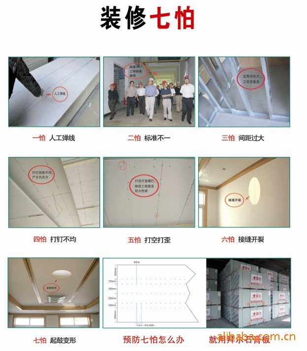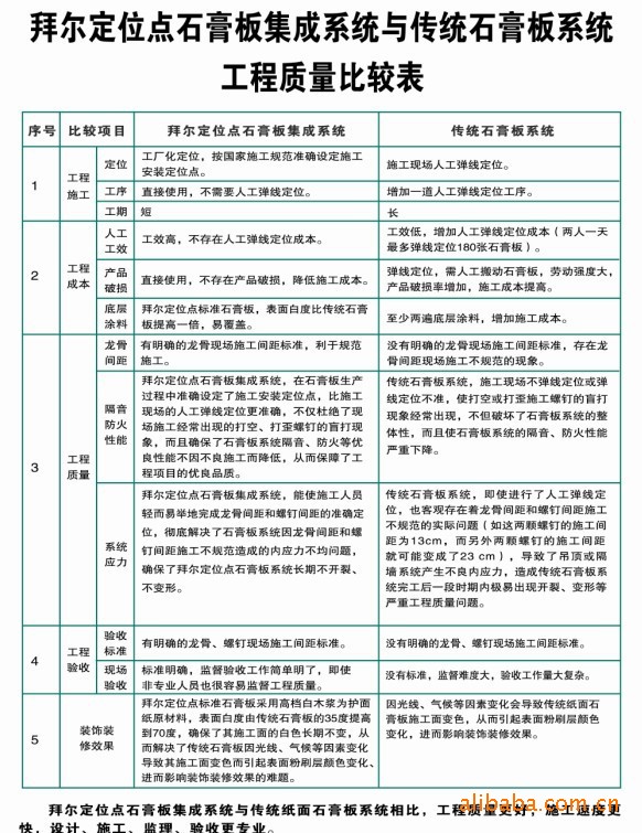 传统石膏板系统,需施工现场人工弹线定位,不但增加了一道施工工序,工期长,工效低,产品破损率高,而且施工定位不准确,严重影响了施工质量和工程质量,这是石膏板系统出现隔音、防火性能下降和开裂、变形等严重工程质量问题的主要原因。拜尔定位点石膏板系统,按照国家施工规范预先在石膏板施工面准确设定了施工安装定位点,实现了工厂化定位,定位准确,施工现场不需要再进行人工弹线定位,直接使用,工效高、工期短、监督验收工作简单明了,不但杜绝了传统石膏板系统无定位点施工经常出现的打空、打歪螺钉的盲打现象,而且确保了石膏板系统隔音、防火等优良性能不因不良施工而降低,并彻底解决了石膏板系统因龙骨、螺钉现场施工间距不均造成的内应力不均及施工不规范而产生工程质量隐患的世界性难题,确保了拜尔定位点石膏板系统长期不开裂、不变形,实现了石膏板系统领域的一次重大技术进步。
