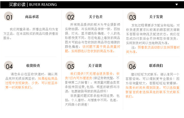 如果碰到有问题的商品请您原装退回并用张纸条写上您的旺旺号,我们可以为您退换或退款。但如果您是因为买错需要退货,请您把所有货物保持原装状态打包退回,当然来回的邮费是由您出,我们不接受到付。
