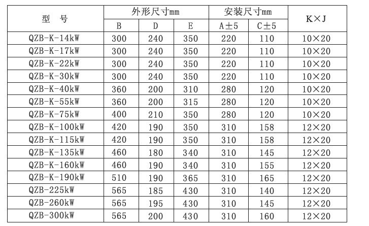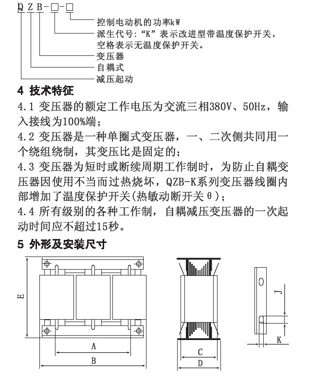 QZB系列自耦变压器适用于交流50Hz ,额定电压380v,额定输出容量300kw及以下的三相鼠笼型感应电动机,作不频繁操作条件下的降压起动,利用变压器降压的特点,降低电动机的起动电流,以改善电动机起动时对输电网络的影响。变压器按GB14048.4及相关标准设计、制造与检验。
