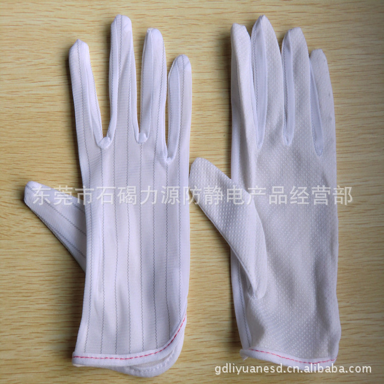 材质:手背涤纶面料, 10mm白色条纹导电绸,表面电阻107,手心全棉棉毛布加PVC防滑小颗粒规格:S、M、L特点:透气性能好,防尘、防静电效果优越包装:10双/袋。主要用于需用防静电点胶手套不易滑落操作,防静电环境如电子、仪表等行业,能防止由于静电所造成的电子元器件损毁、老化;在石化行业能防止由于静电所引起的燃烧、爆 炸等危险。