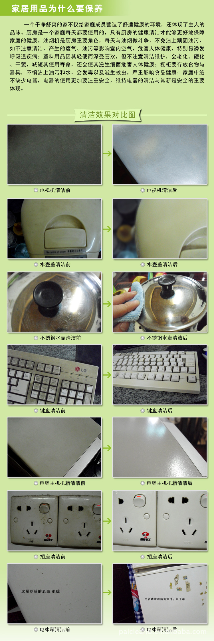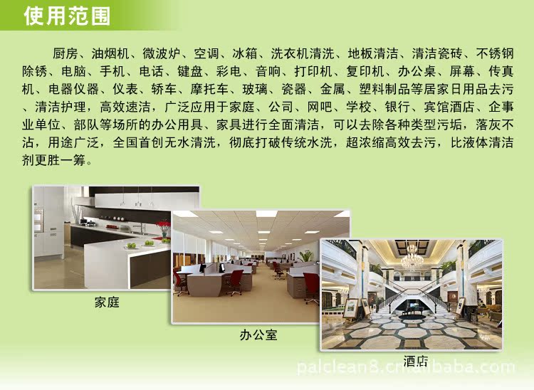 使用范围 | 油烟机、屏幕、电脑、手机、打印机、复印机、办公桌、传真机、电话、电器仪器、仪表、空调、冰箱、彩电、微波炉、音响、轿车、摩托车、塑料制品等,广泛应用于家庭、公司、网吧、学校、银行、宾馆酒店、企事业单位、部队等进行全面清洁,可以去除各种类型污垢,落灰不沾,用途广泛。 |