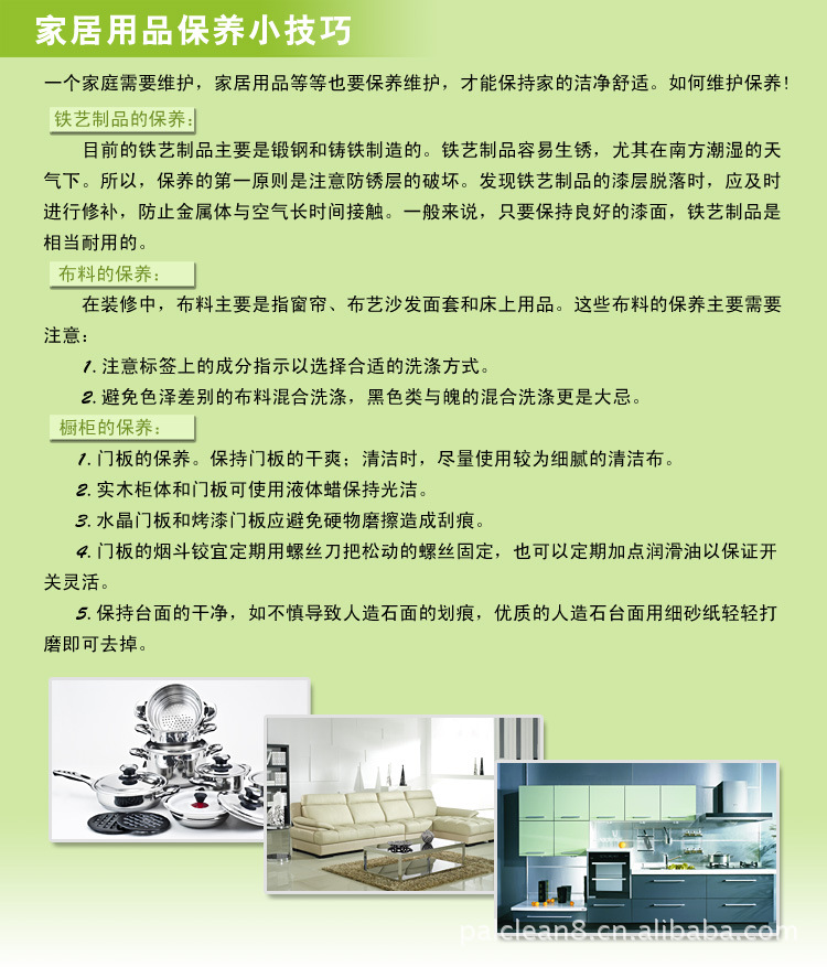 5、对布沙发、各种地板和装饰墙,可取适量清洁膏溶于60度左右水中溶解后清洁。