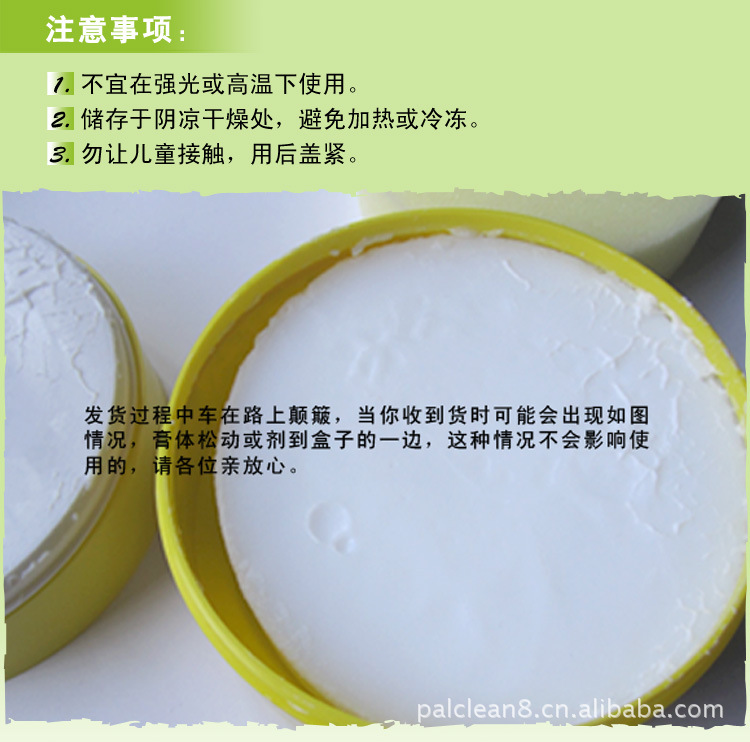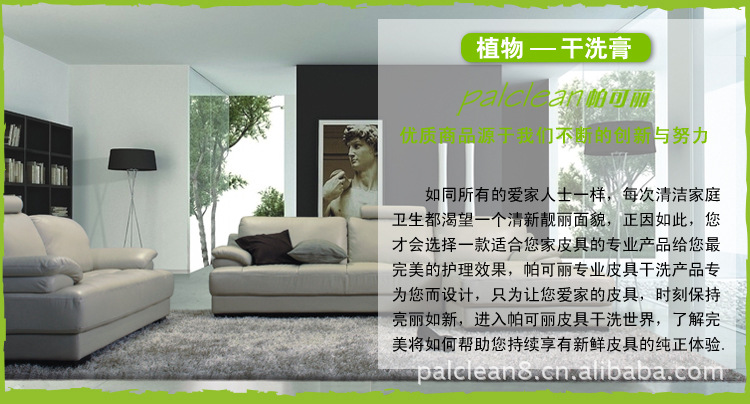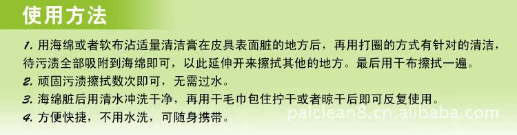 产品说明 | 本品独特的去污配方,根据化妆品原料工艺生产,能有效分解皮革皮纹深层的顽固污渍和污垢,达到高效去污效果,恢复皮革洁白亮丽的完美效果,而且本品是一种对皮肤无刺激、无伤害的新型绿色环保清洁膏。 PALCLEAN特有去污因子、苏尔杀菌原液、硅油、护革蛋白、抗静电、天然植物提取液 |