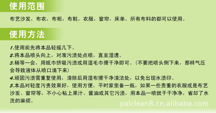 4、顽固污渍需重复使用,清除后用湿布擦干净清洁处,以免出现水渍印。5、本品对轻度污责效果好,使用方便,并且平时家里备一瓶,如果一些贵重的衣服或是布艺沙发,窗帘那些,不小心粘上果汁、酱油之类的东西,用本品一喷就干干净净,省却了水洗的麻烦。