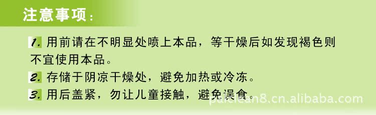 注意事项:用前请在不明显处喷上本品,等干燥后如发现褐色则不宜使用本品。