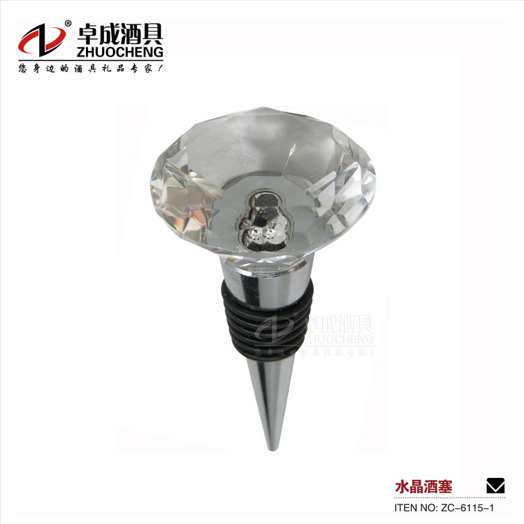 【品名】 水晶头六丝酒塞 【编号】 ZC-6115-1 【材质】 锌合金 +水晶玻璃材质 | 表面为电镀鉻工艺 | 酒塞上配置6丝硅胶 |